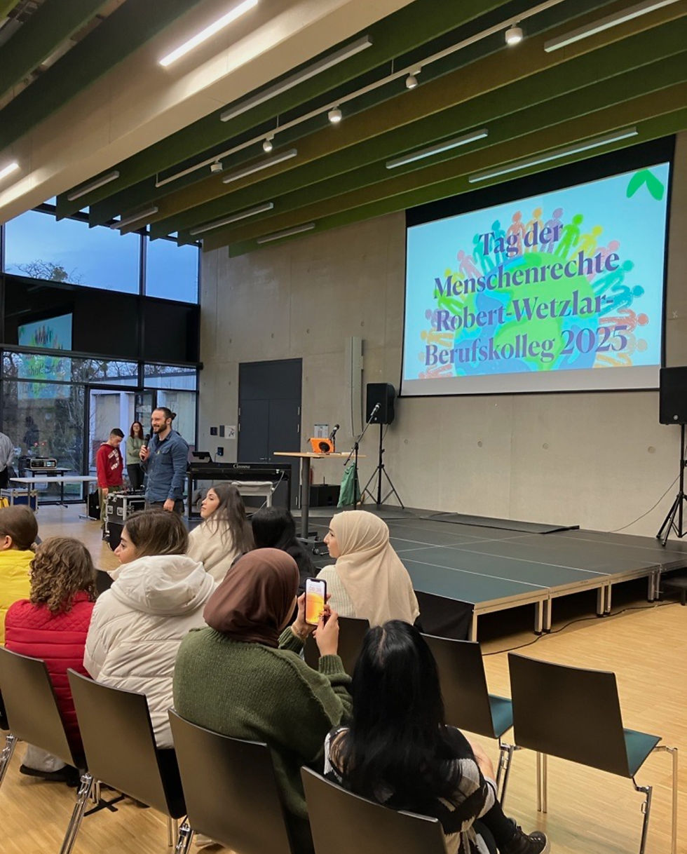 Der Tag der Menschenrechte begann mit einer gemeinsamen Feier in der Aula. Unser Schulleiter, Herr Anselm, betonte in seiner Ansprache den großen Wert der Menschenrechte, vor allem, wenn uns zeitgleich drastische Bilder aus der ganzen Welt ereilen würden. Gleichzeitig sei der Alltag vieler Menschen durch Gewalt im Netz geprägt. Ziel sei es, dass sich alle Schüler*innen mit dem Thema beschäftigten. Herr Anselm dankte allen Kolleg*innen, die den Tag vorbereitet haben. Im Anschluss wurde viel gemeinsam gesungen: Alia, Michelle und Cynthia stimmten „We shall overcome“ und „Stay“ von Rihanna an, musikalisch unterstützt durch Musiklehrer Herrn Hiltawski. Pfarrer Schwarz erzählte die Geschichte von dem König, der entscheiden musste, welcher seiner drei Söhne sein Reich erben sollte. Der jüngste Sohn würde das Reich wohl erben, weil er die kleinen Dinge schätzt und im Leisen wirkt. Anschließend wurde ein Video über digitale Gewalt im Netz gezeigt. Das Video warf die Frage auf, wann fängt digitale Gewalt an. In ihm werden Statements von betroffenen Mädchen, Jungen, jungen Frauen und jungen Männern gezeigt. Unser neuer Musiklehrer Herr Klassen rundete den Auftakt ab, indem er zusammen mit den Anwesenden „Imagin“ von John Lennon interpretierte. Auf die Frage: „Was hat sie am meisten berührt?“ äußerten die Schüler*innen der Berufsfachschule 2 Ernährungs- und Versorgungsmanagement: „Das Video“. Interessant fanden sie die Geschichte von dem König mit seinen Söhnen; die musikalischen Beiträge waren ihr Highlight. Astrid Josten